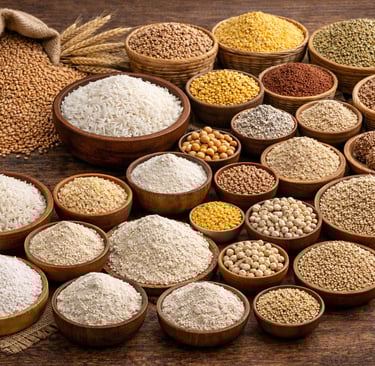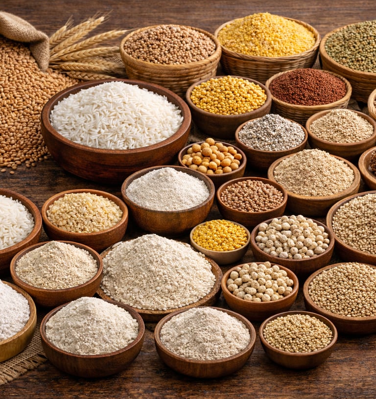 Export-quality Indian grains including rice, wheat, and millets, graded for size, purity, and international trade standards.